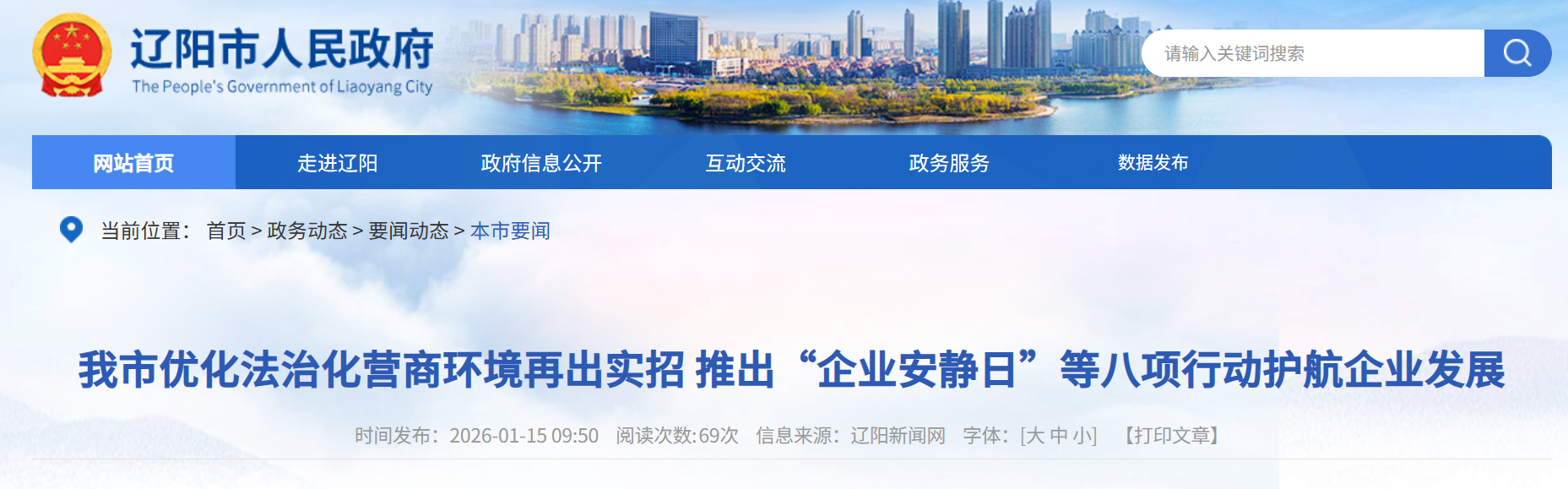 1月14日,在辽阳市政府新闻办举办新闻发布会上了解到,辽阳市全面贯彻落实辽宁省优化营商环境大会安排部署,制定《辽阳市规范涉企行政执法行动方案》,对优化法治化营商环境再出实招,推出“企业安静日”等八项行动护航企业发展,为实现新时代辽阳全面振兴、奋力谱写中国式现代化辽阳实践提供坚实的法治保障和支撑。