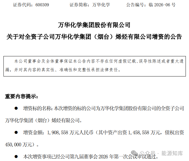 增资后,万华烯烃公司注册资本将由300,000万元增加至400,000万元,仍然为万华化学的全资子公司。