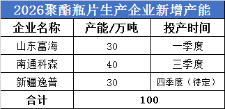 2026年瓶片预计新增产能约100万吨,总产能将突破2200万吨。瓶片装置自2023年以来持续高产能投放,当前行业供应已处充裕水平,上半年旺季需求回暖,预计带动供需双增;下半年步入需求淡季,叠加新产能投放有限,瓶片行业供需压力将逐步缓解,推动利润从低位回升。