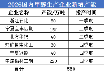 2026年甲醇预计新增产能550万吨,包括多套CTO装置配套甲醇。其中浙江石化是为了补充已有醋酸装置的外采缺口,兖矿鲁南化工则是新旧产能置换,规模较大的装置主要有宁夏宝丰四期、中煤榆林二期,均是煤化工一体化扩建/新建,配备配套相应MTO下游,外销商品甲醇增量有限。