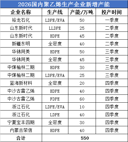 2026年PE预计新增产能550万吨,总产能有望突破4500万吨。下半年PE产能释放节奏明显加快,三四季度成为投产高峰期,包括华锦阿美95万吨、中沙古雷100万吨等重点项目,新增产能以全密度装置、HDPE装置为主,LLDPE投产速度持续放缓。