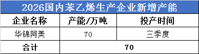 苯乙烯2026年仅有华锦阿美一套70万吨/年装置投产,全年投产压力较小。但2025年10月份广西石化、吉林石化各60万吨产能以及年底国恩20万吨产能刚刚投产,因此苯乙烯2026年全年虽供应压力整体较小,但在一季度目前仍然高企的港口库存将面临较大压力。