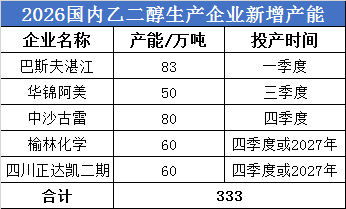 2026年乙二醇新增产能集中投放,预计新增产能333万吨,投产时间集中在下半年。预计中国乙二醇行业产能仍维持增长趋势,到2030年中国乙二醇行业产能将超过4000万吨/年。后续炼化一体化项目规划逐步向其他乙烯下游产品倾斜,新增产能规模逐步收窄。