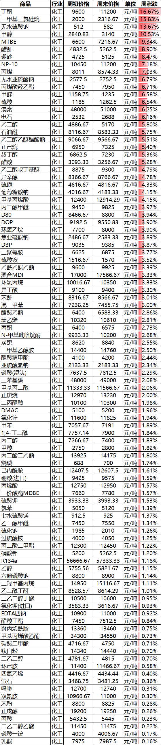 拉长周期来看,本轮化工原料涨价潮已持续多周,受国际原油价格高位震荡、地缘因素扰动影响,上周国内化工原材料整体仍维持上行态势,涨价范围持续扩大。数据显示,丁酮、一甲基三氯硅烷、无水硫酸钠、甲醇等上周度涨幅超过10%,不过相较于前一周,全行业涨价节奏略有放缓,市场疯涨势头开始出现松动迹象。